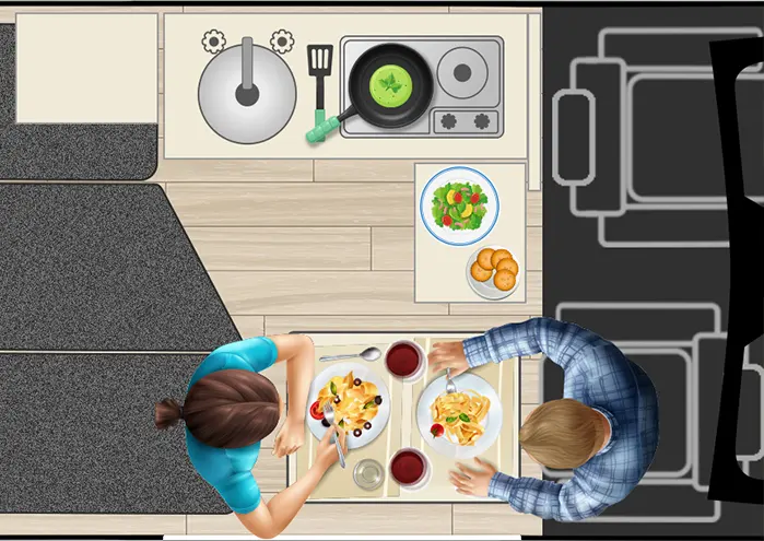 Avec les options 'petite table amovible sur pied U.S.' et 'siège passager sur base tournante' il est possible de prendre confortablement ses repas à deux en conservant le lit permanent en place et tout en gardant l'accessibilité aux équipements.
