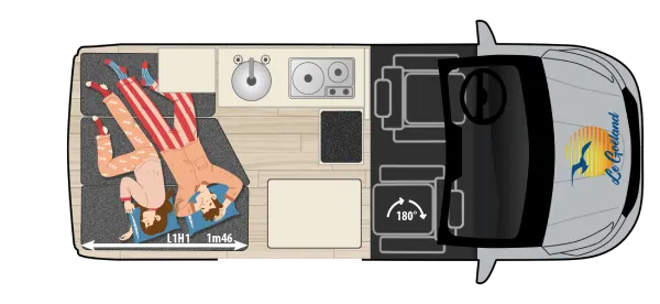 Le Goëland est idéal pour deux personnes, voire un couple avec un enfant en bas age. La priorité a été donnée à l'espace disponible à l'intérieur. Aucune manipulation compliquée n'est requise pour configurer le van en position 'nuit' et, cerise sur la gateau, vous pouvez le laisser en position 'nuit' en permanence et continuer à profiter de tous les équipements. C'est d'ailleurs ce que font désormais la majorité des utilisateurs du Goëland.