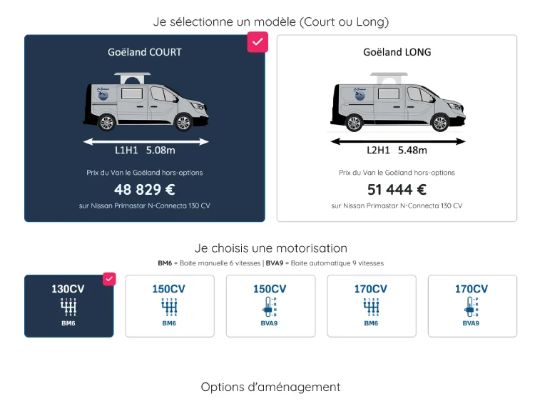 Grâce à notre configurateur vous allez créer votre Goëland avec plusieurs variations possibles autour d'une même base et générer un fichier pdf récapitulatif spécifique pour chaque version. Vous pourrez ainsi ajuster votre projet à votre budget.