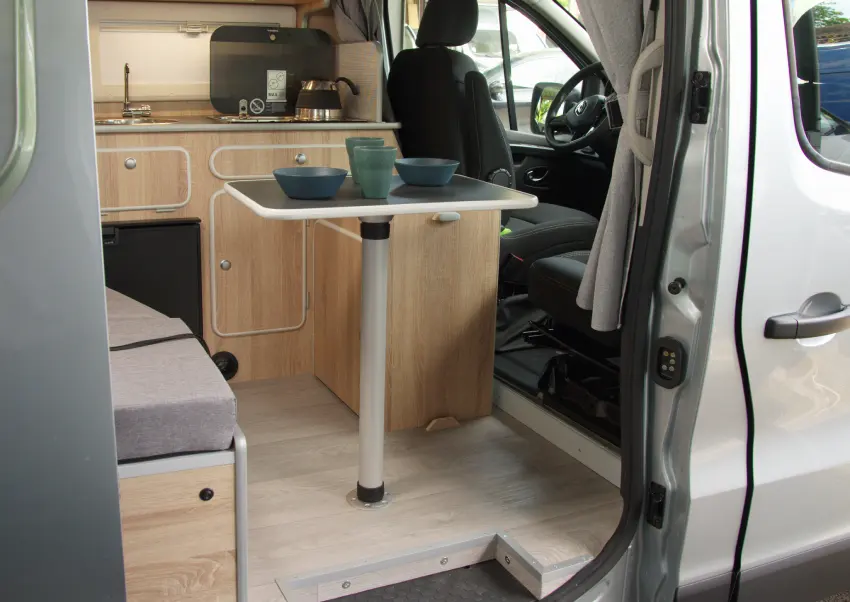 Avec le siège passager tournant (en option: 'siège complet' ou 'base tournante sur siège existant'), vous pouvez dîner à deux très confortablement. La table disparaît en un tour de main pour libérer l'espace quand il le faut.